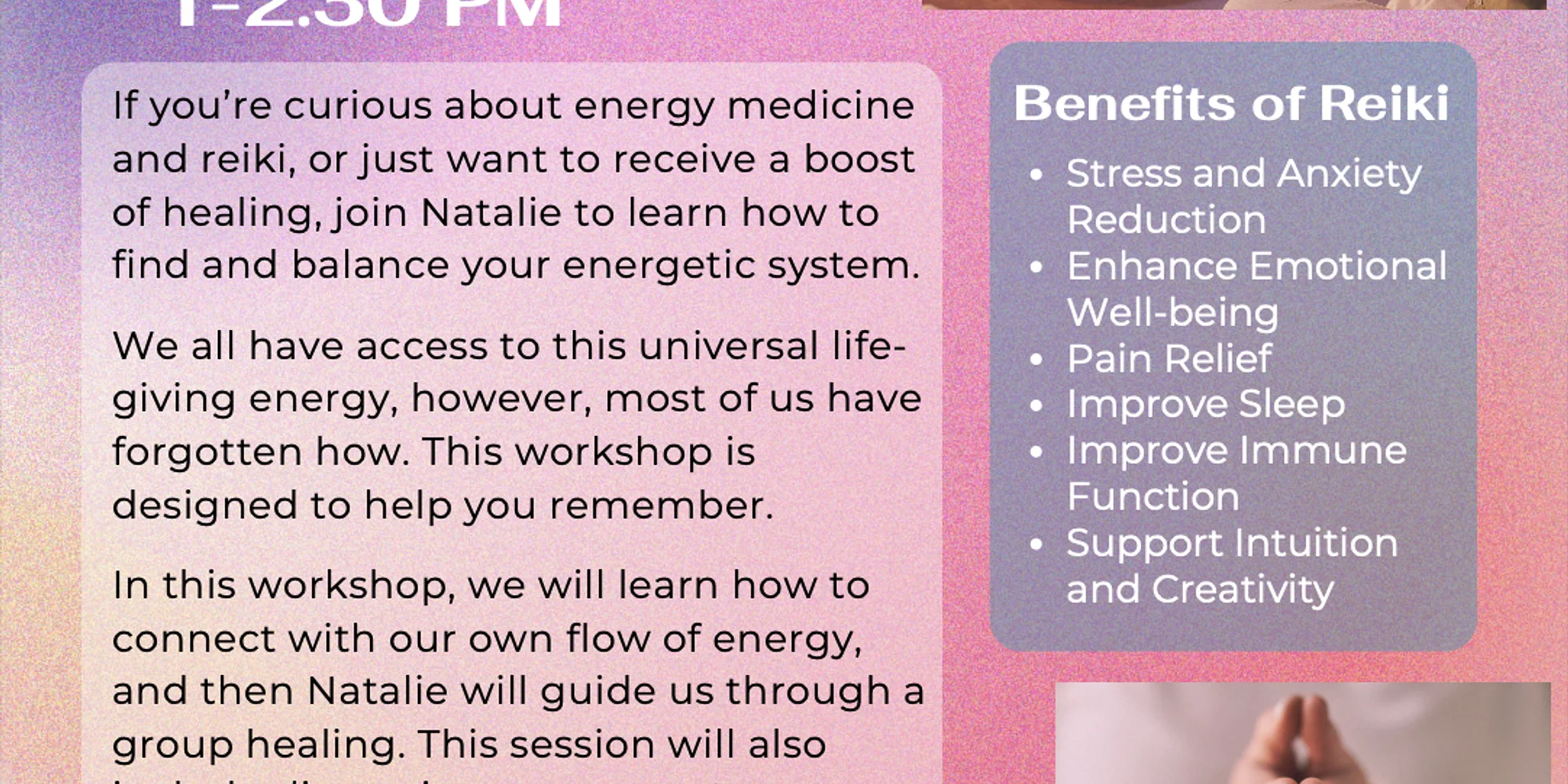 If you’re curious about energy medicine and reiki, or just want to receive a boost of healing and inspiration, join Natalie Colvin to learn how to find and balance your energetic system. We all have access to this universal life-giving energy, however, most of us have forgotten how. This workshop is designed to help you remember. In this workshop, we will connect with our own flow of energy, and Natalie will guide us through a group healing. This session will also include discussion, movement, breathwork, and sound healing. Expect fun hands on tools to help you connect with your own energy. Investment: Sliding scale $15-$35 ($10 BYC Karma Program Students) *Contact the studio to pay less or more than listed price.