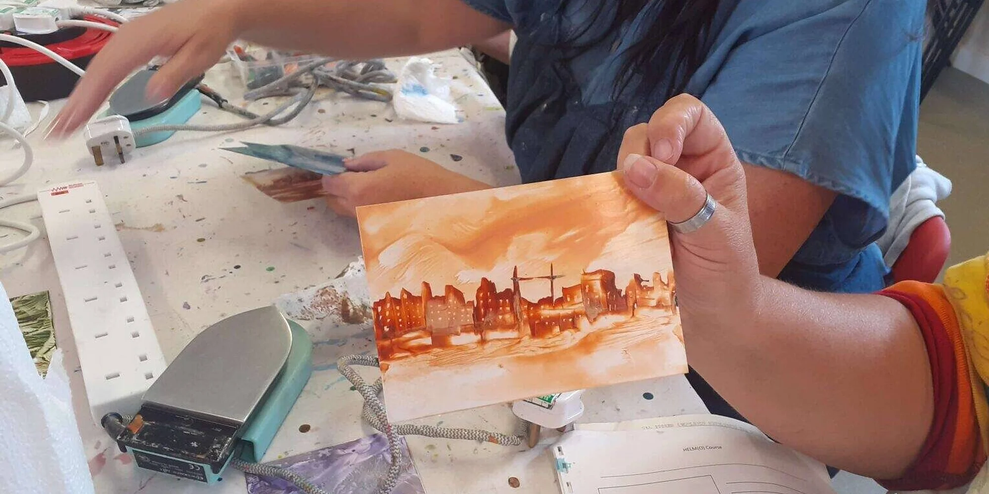 Come discover and create using the encaustic art medium! This engaging 2-hour workshop with Carolyn Childs introduces participants to the versatility of encaustic painting and explores a variety of techniques using a hot iron and encaustic wax. Artists of all skill levels are welcome and will have the opportunity to create unique works on multiple surfaces. In addition to foundational encaustic techniques, Carolyn will introduce collage elements, layering imagery and materials beneath translucent beeswax to create richly textured, luminous mixed-media pieces. Bring your curiosity and a willingness to explore. Enjoy a restorative, hands-on creative experience in a warm and supportive environment. Encaustic is an ancient method of painting with wax. Pure beeswax is blended with resin and pigment, then applied in layers. Each layer is melted and fused with heat to the surface, creating depth, texture, and a beautiful luminous finish. You will learn how to work confidently with hot wax to create expressive and beautiful works of art. Introduction to Encaustic Painting Workshop 5/1/26 "*" indicates required fields Name* First Last Address Street Address Address Line 2 City AlabamaAlaskaAmerican SamoaArizonaArkansasCaliforniaColoradoConnecticutDelawareDistrict of ColumbiaFloridaGeorgiaGuamHawaiiIdahoIllinoisIndianaIowaKansasKentuckyLouisianaMaineMarylandMassachusettsMichiganMinnesotaMississippiMissouriMontanaNebraskaNevadaNew HampshireNew JerseyNew MexicoNew YorkNorth CarolinaNorth DakotaNorthern Mariana IslandsOhioOklahomaOregonPennsylvaniaPuerto RicoRhode IslandSouth CarolinaSouth DakotaTennesseeTexasUtahU.S. Virgin IslandsVermontVirginiaWashingtonWest VirginiaWisconsinWyomingArmed Forces AmericasArmed Forces EuropeArmed Forces Pacific State ZIP Code Phone* Email* Intro to Encaustic Painting Member Quantity Price: $75.00 Quantity Intro to Encaustic Painting Non Member Quantity Price: $90.00 Quantity Total Payment Method Credit CardPayPal Checkout American Express MasterCard Visa Supported Credit Cards: American Express, MasterCard, Visa Card Number Expiration Date Security Code Cardholder Name Δ Carolyn Childs is a Connecticut native based in Darien, where she works as an artist and educator. A certified K–12 art teacher, she holds a BFA in Creative Arts Therapy and an MA in Art Education Leadership, with a focus on mindfulness and the healing arts. Carolyn has taught art in a wide range of settings—from public and private schools to healthcare institutions—and brings a deep commitment to the therapeutic power of creative expression. Recently, Carolyn has been leading workshops and facilitating art experiences at regional arts centers, Her studio practice is based at the 5 AM Arts Collective in Norwalk, where she continues to explore the intersections of art, mindfulness, and healing.