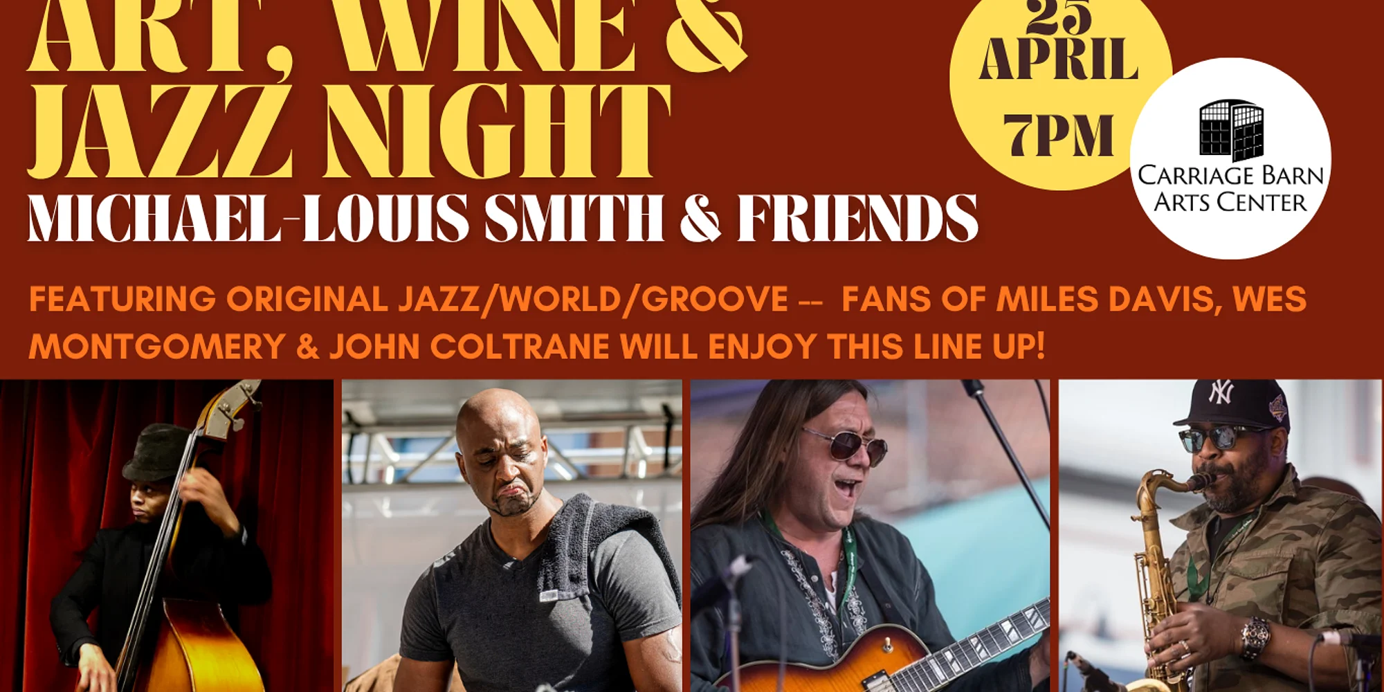 Featuring Saxophonist Martin Kelley, Keys TW Sample, Bassist Diallo House, Guitarist Michael-Louis Smith, and Drummer Ismail Lawal Returning to the Carriage Barn with a powerhouse live show that includes virtuosic solos, original compositions and telepathic band interplay! The musicians are an integral part of the modern jazz scene and brotherhood in mind and spirit who've performed together for over 20 years! Advance tix $35 / $40 at the door Guests 21 + may enjoy refreshments courtesy of Stewart's Spirits Jazz Night at the Carriage Barn, April 25, 2026 Advance tickets for Saturday April 25, 7-10pm "*" indicates required fields Name* First Last Address* Street Address City State / Province / Region ZIP / Postal Code Email* Reserve a chair Chairs are limited- please check only if you require a seat. 1 chair A chair for each ticket purchased Jazz Night at the Carriage Barn Quantity* Price: $35.00 Quantity enter ticket quantity Total Payment Method Credit CardPayPal Checkout American Express MasterCard Visa Supported Credit Cards: American Express, MasterCard, Visa Card Number Expiration Date Security Code Cardholder Name Δ