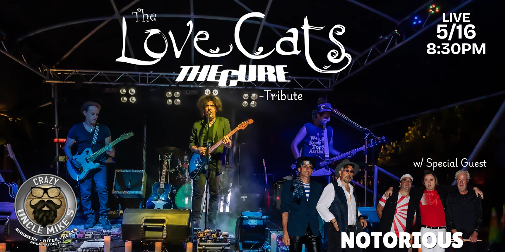 The LoveCats, from Hollywood Florida, take you on an immersive musical journey through The Cure’s multidecade collection. From Post Punk hits like “Boys Don’t Cry”, to the goth and gloom of “A Forest”, to the dance hits of “Why Can’t I be You” and “Friday I’m in Love”. The band from South Florida provides a true, full tribute to The Cure with the look, sound and feel of The Cure’s live shows. Come dressed in your best dark and gothic look. GET YOUR TICKETS NOW! May 16th:The Love Cats – Tribute To The Cure  Can’t make it, don’t worry all of Crazy Uncle Mike’s shows are streamed straight to your living room on our Youtube & Facebook!  https://www.eventbrite.com/e/the-love-cats-tribute-to-the-cure-tickets-1987017505849?aff=oddtdtcreator