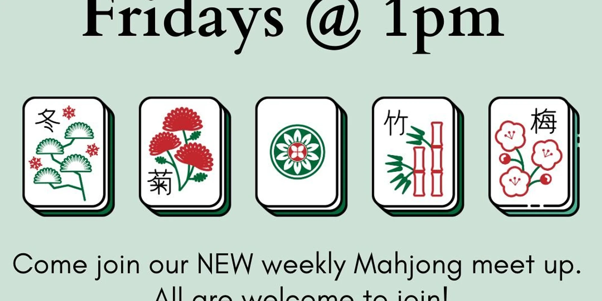 Come join our NEW weekly Mahjong meet up. All are welcome to join! (Even if you’ve never played before.) There will be someone here to teach beginners and the library has two American Mahjong sets available.