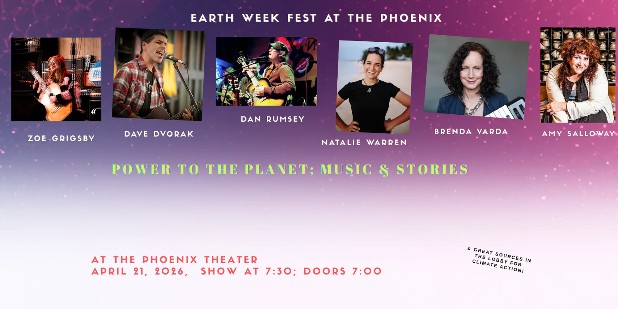 Some of the Best TC songwriters and spokenword bringing their takes on the planet. From Americana to Blues to Pop and more --Come and join the sounds...and with our great lobby tablers find out how you can have more of an impact locally. https://sci-arts.org/earth-week-2026-1 And some great samples of local eco products. Tickets are 'PWYW' - ($5-$20) Doors open at 7:00 pm Dave Dvorak – Songwriter/Musician- www.zoesaysgo.com Brenda Varda – Music/Stories - www.brendavarda.com Dan Rumsey – Songwriter/Musician - www.danrumseymusic.com/ Zoe Grigsby – Songwriter/Musician - https://zoegrigsbymusic.wixsite.com/my-site Amy Salloway - Storytelling - https://www.facebook.com/awkwardmomentonstage GUEST SPEAKER: Natalie Warren, www.natalie-warren.com Canoe Paddler, Activist & Scholar in Climate Communications—- & Author of "Hudson Bay Bound Two Women, One Dog, Two Thousand Miles to the Arctic" MORE INFO: https://sci-arts.org/earth-week-2026-1 Hosts: Wordspace-Musicspace, Sci-Arts, and kudos to Climate Reality
