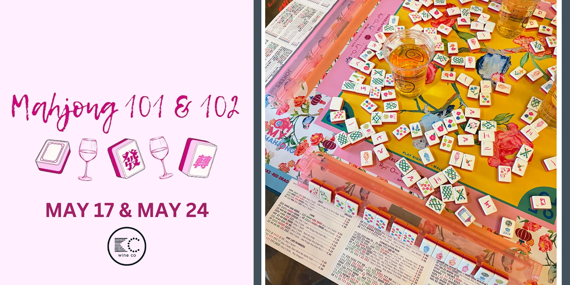 Grab a glass of wine and join in on the Mahjong craze with this two-part beginner class! This is a 2 part class held on 5/7 & 5/14. Your ticket price includes both classes & a drink ticket for each day! Mahjong is having it's moment, and it's time for you to finally get in on the fun! This class is the perfect opportunity for you to learn it in a relaxed, social setting. Join us at the winery for a two-part Sip & Play experience! Come with a friend, your book club, your mom — or come solo and meet some new friends! Mahjong 101 • The different tiles and how to recognize them • Basic gameplay and the objective • How the deal works • The Charleston passing process Mahjong 102 •Quick review of the basics • Guided gameplay • Strategy help as situations come up • Playing through a couple of real games together at an easy pace No prior experience needed. All materials will be provided-- just bring yourself, grab a glass of wine, and get ready for your newest obsession!!! tickets tickets