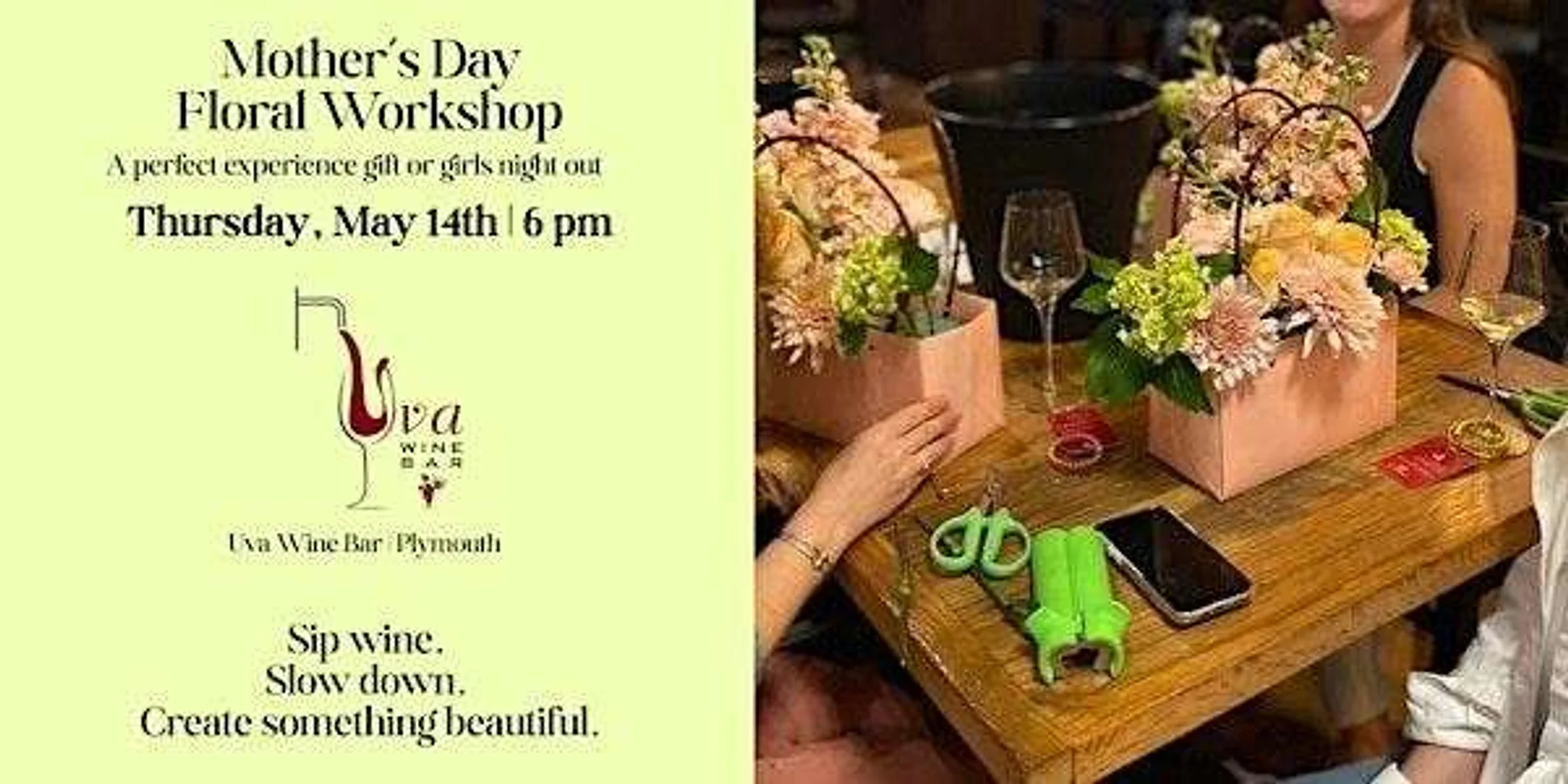 This event is perfect as a Mother’s Day experience gift, a fun girls night out or a chance to treat yourself. No experience is needed. All flowers and materials are provided and you’ll leave with a gorgeous arrangement to take home.