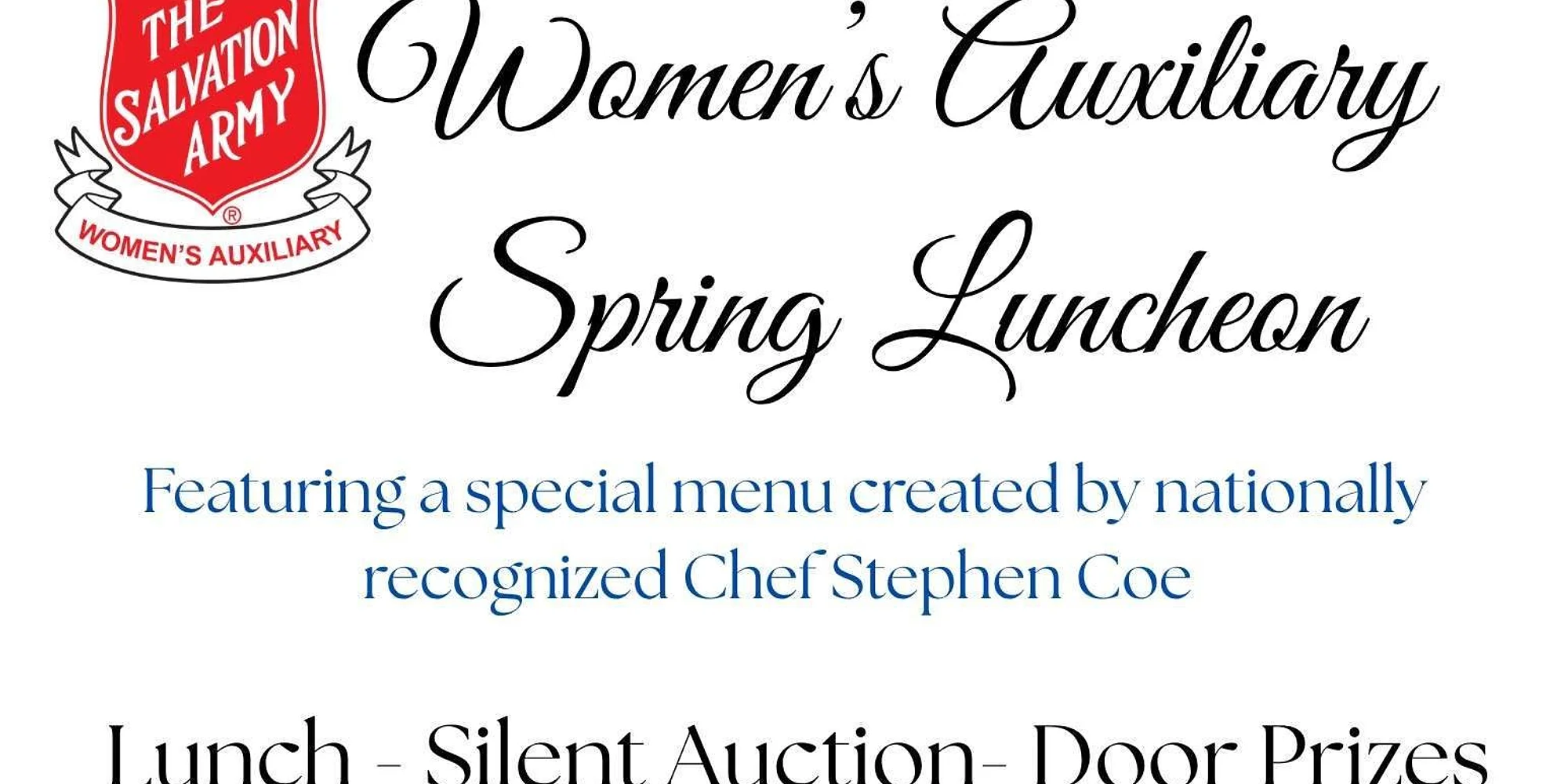 You are welcome to join us for the Plymouth Salvation Army Women’s Auxiliary Spring Luncheon. Your specially priced ticket will provide a lunch featuring a special menu created by nationally recognized Chef Stephen Coe. There will be door prizes as well as an opportunity to bid on silent auction items. To purchase tickets please visit salvationarmyma.org/auxiliary or call Lucinda Carpenter (508) 662-8335.